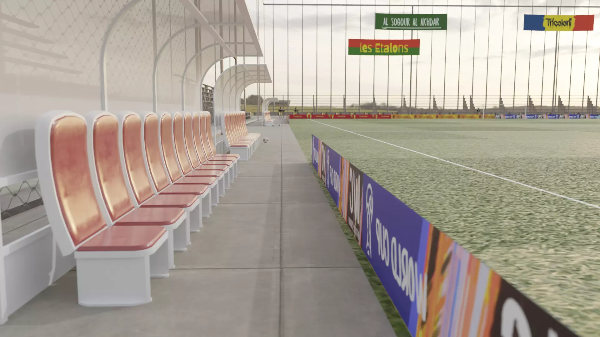 Includes; Stadium lights, scoreboard, grandstand with seats, team's bench, ball, cameras, goal, all countries flags, banners for adverts and banners for the top 60 national teams in the FIFA ranking.