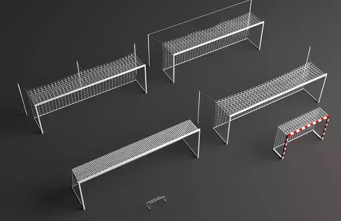 This comprehensive 3D model pack includes a collection of high-quality soccer/football goals in various standard sizes, from full-size 11-a-side pitches to youth training, futsal (indoor soccer), and handball goals. Each goal features detailed white metal frames with realistic hexagonal netting, accurate dimensions, and clean geometry. Some variants include red-white striped posts for handball/futsal styles. Perfect for sports visualizations, stadium scenes, game development, animations, VR/AR experiences, or architectural renders of sports facilities. Low-poly optimized with high-detail textures for efficient rendering.