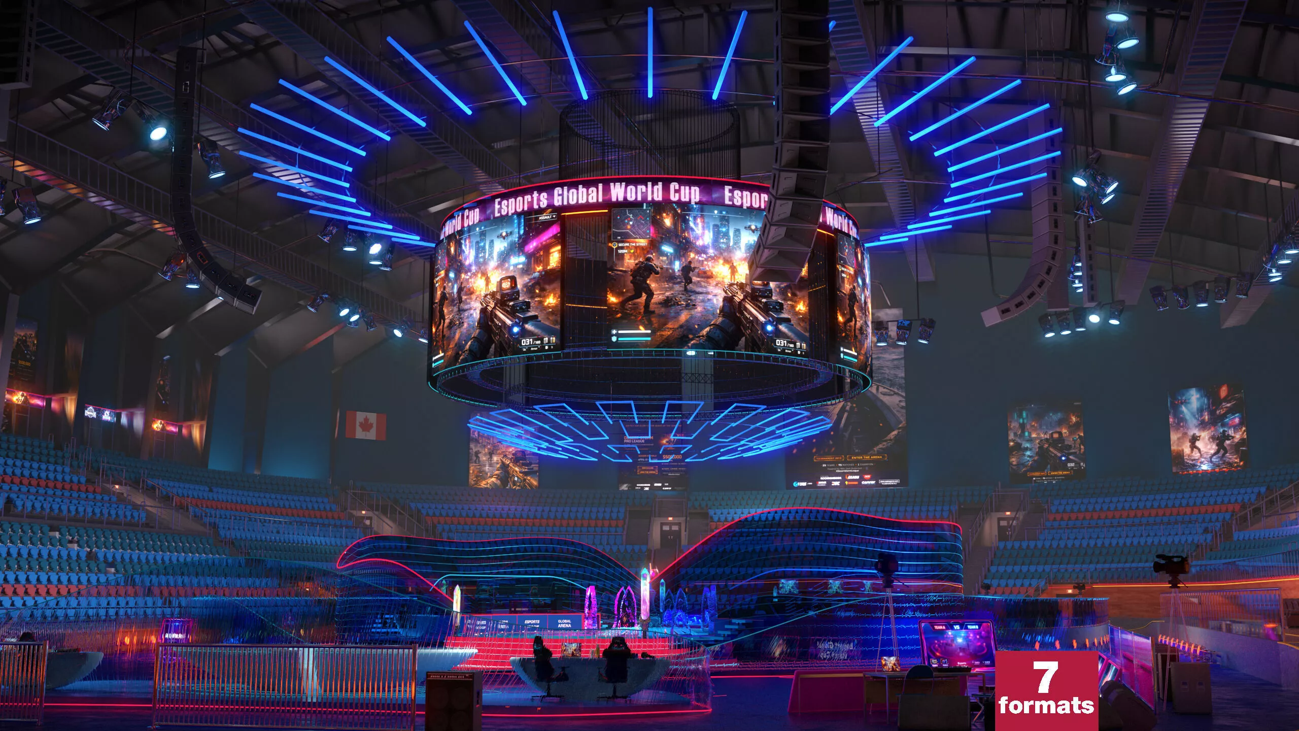esports, esports arena, esports stadium, gaming arena, tournament stage, championship stage, esports environment, stadium interior, arena environment, gaming setup, broadcast studio, virtual production, LED screens, arena lighting, neon lighting, futuristic arena, cyberpunk style, sci-fi environment, stage design, circular stage, competition arena, event stage, stadium seating, audience stands, digital arena, high tech environment, gaming event, esports broadcast, production set, cinematic environment, real-time environment, unreal engine, unity ready