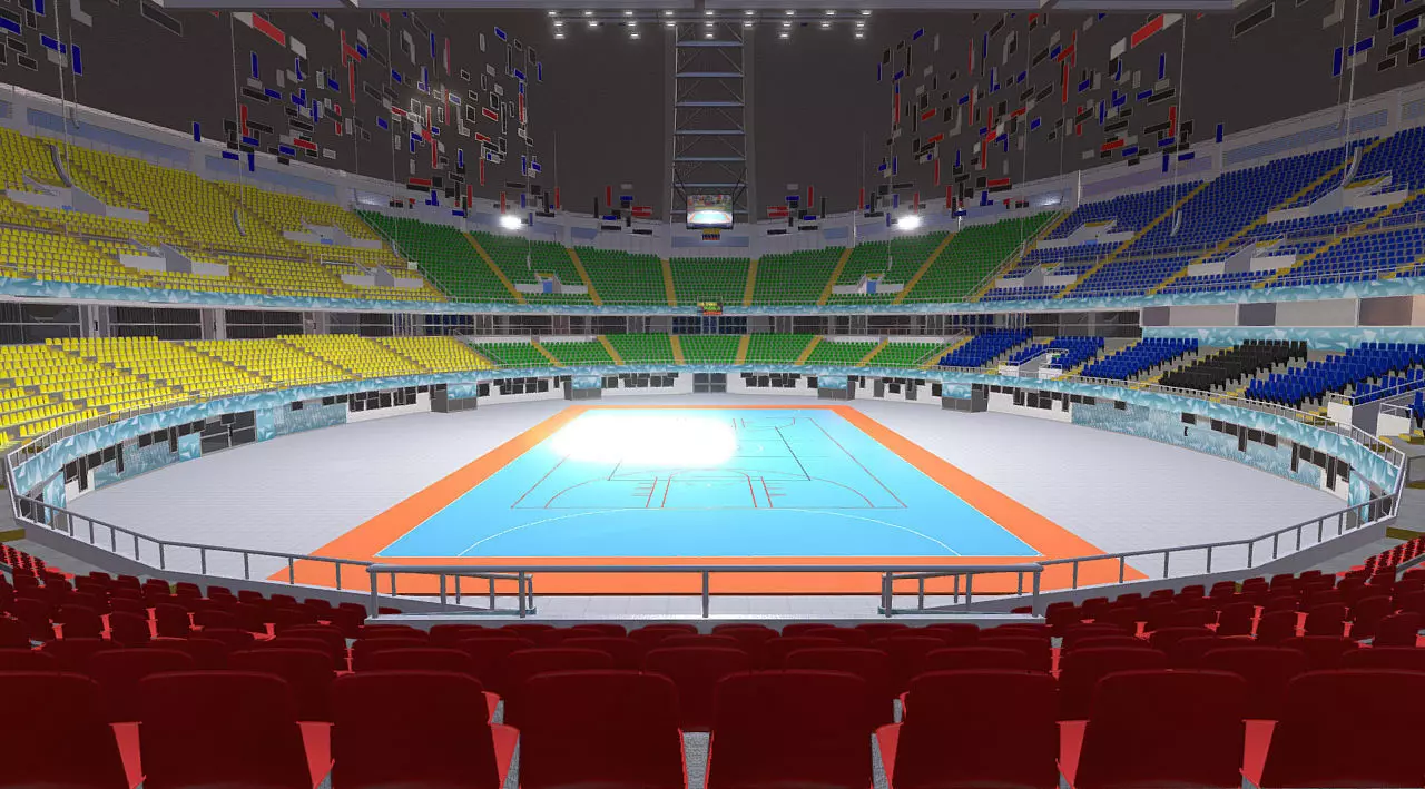 I made some appearance changes with respect to the real one to make it look a little more stylized; I added more white color and I used a blue wallpaper in more surfaces than the real one. The handrails, the separators on the stands, the fences between tiers, the gates and the doors have a completely different design with glass. I also made a court resembling the one used in the Futsal world cup but with the addition of marking lines for basketball and volleyball.
