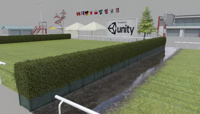 4 Horse jumps (different variations, including water and wood at various heights) 2 Advertising hoardings Tent structure 2 Camera towers 3 Track-side buildings 9 Flags Floodlight Scoreboard 2 Trees