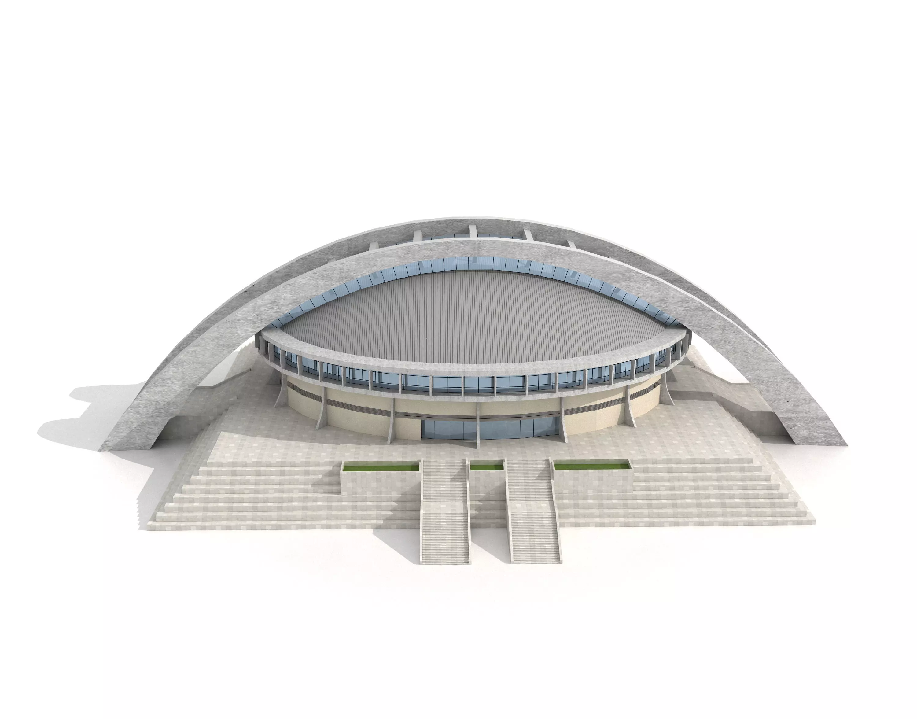 The comprehensive sports center is located in the east area of Tsinghua University campus, along the central axis of the main building, and is surrounded by the Dongda playground to form a sports center area. The comprehensive sports arena is a venue that integrates sports competitions, training, teaching, conferences, and performances. The maximum size of the competition venue is 55m × 35m. The seating consists of fixed seats and activity seats, with a total of 5000 seats, including a podium and a referee's seat. The first floor is equipped with auxiliary rooms such as athlete training rooms and VIP rooms. The structure of the competition hall adopts a 110 meter span reinforced concrete arch and a suspended lightweight roof, reflecting the power and beauty of sports architecture. There is a skylight between the two arches, which fully utilizes natural light for regular training and teaching.Model making software: 3ds Max 2014 Rendering software: vray3.60.03 for 3dmax2014,If you have any questions, write me: wjjmsn2020@gmail.com。