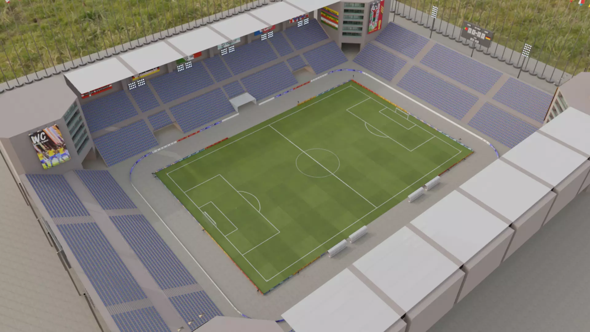 Includes; Stadium lights, scoreboard, grandstand with seats, team's bench, ball, cameras, goal, all countries flags, banners for adverts and banners for the top 60 national teams in the FIFA ranking.
