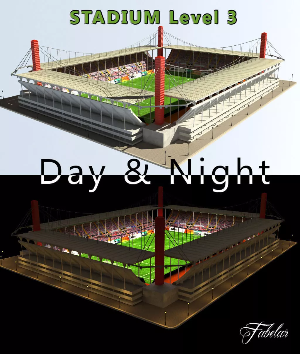Stadium level 3 lowpoly 3D model. Vray, scanline, multiple import formats. Nighttime and Daylight settings.
