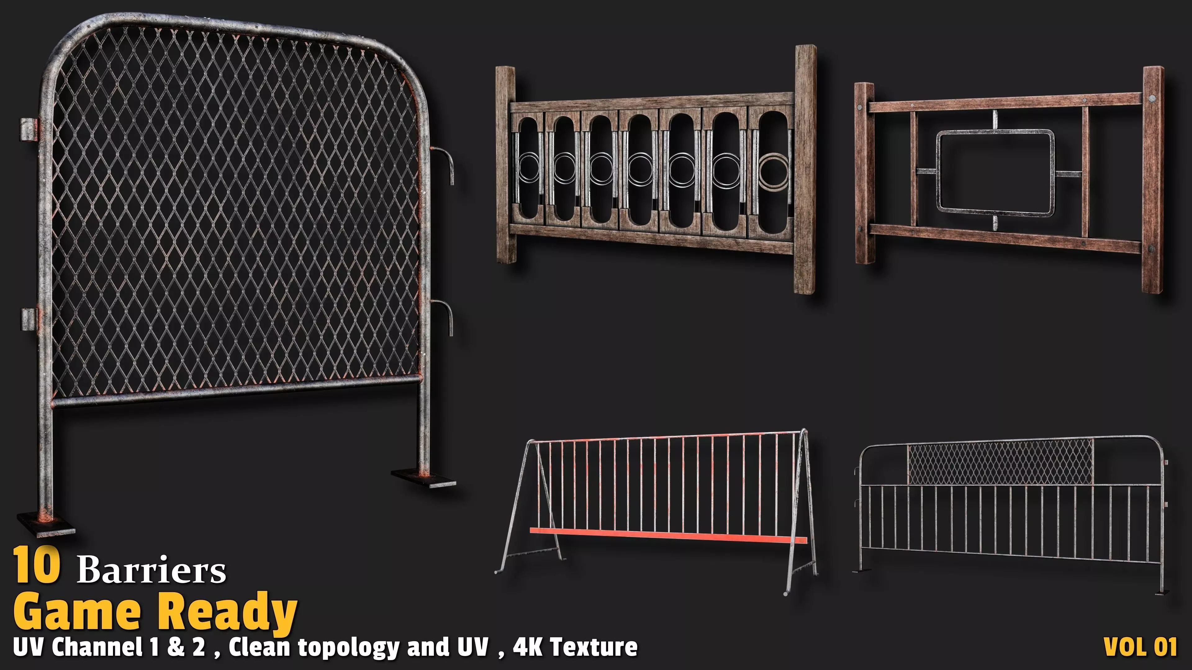Ready to safeguard your game world with realistic, ready-to-use barriers? This collection of 10 textured 3D barrier models, crafted with professional materials and 4K textures (including Base Color, Normal, and ORM), is designed to add dynamic and captivating elements to your game development projects! Whether you're building a bustling city with traffic barriers or designing an action game with physical challenges, these models deliver unmatched quality and realistic detail for an immersive gaming experience. Each model features a clean, quad-based topology with polygon counts ranging from 500 to 6,000, offering a perfect balance between performance and detail. UV-unwrapped with 2 texture channels, this set is fully optimized for seamless integration into your game environment without any additional adjustments.