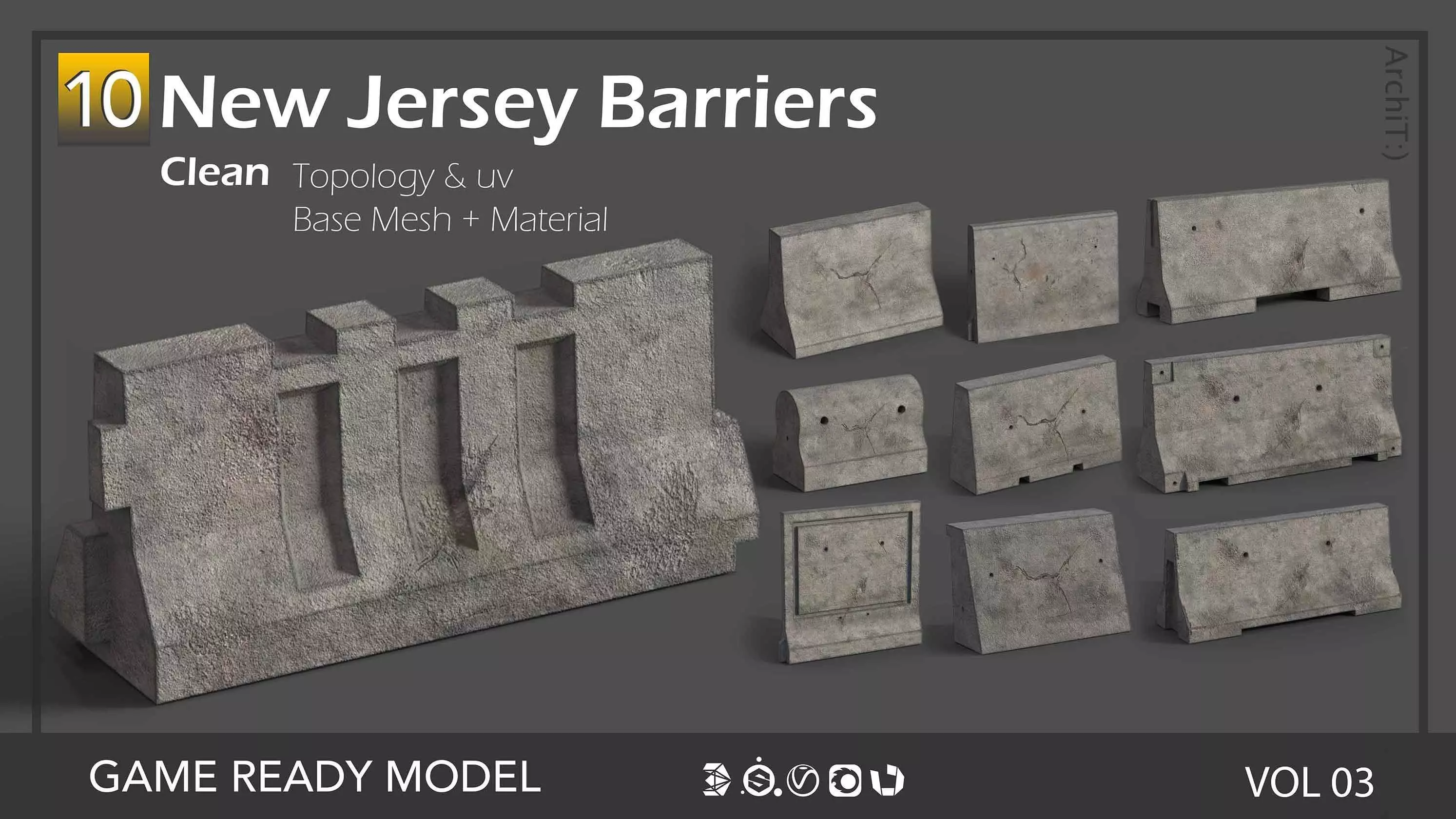 10 high quality and Game_Ready models of various types of Newjersey Barriers as base mesh. 1k, 2k and 4k textures are available. designed by 3ds Max software and texturing in Substance Painter. The models created as standard quad topology and can be easily change in any forms. All models are made in such a way that you can easily use them together. You can use this models in any 3D softwares and game engines.