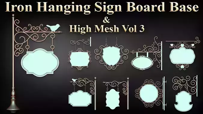 This pack includes 30 iron hanging sign board 3d models as a base and high mesh to add more detail in your 3d projects.