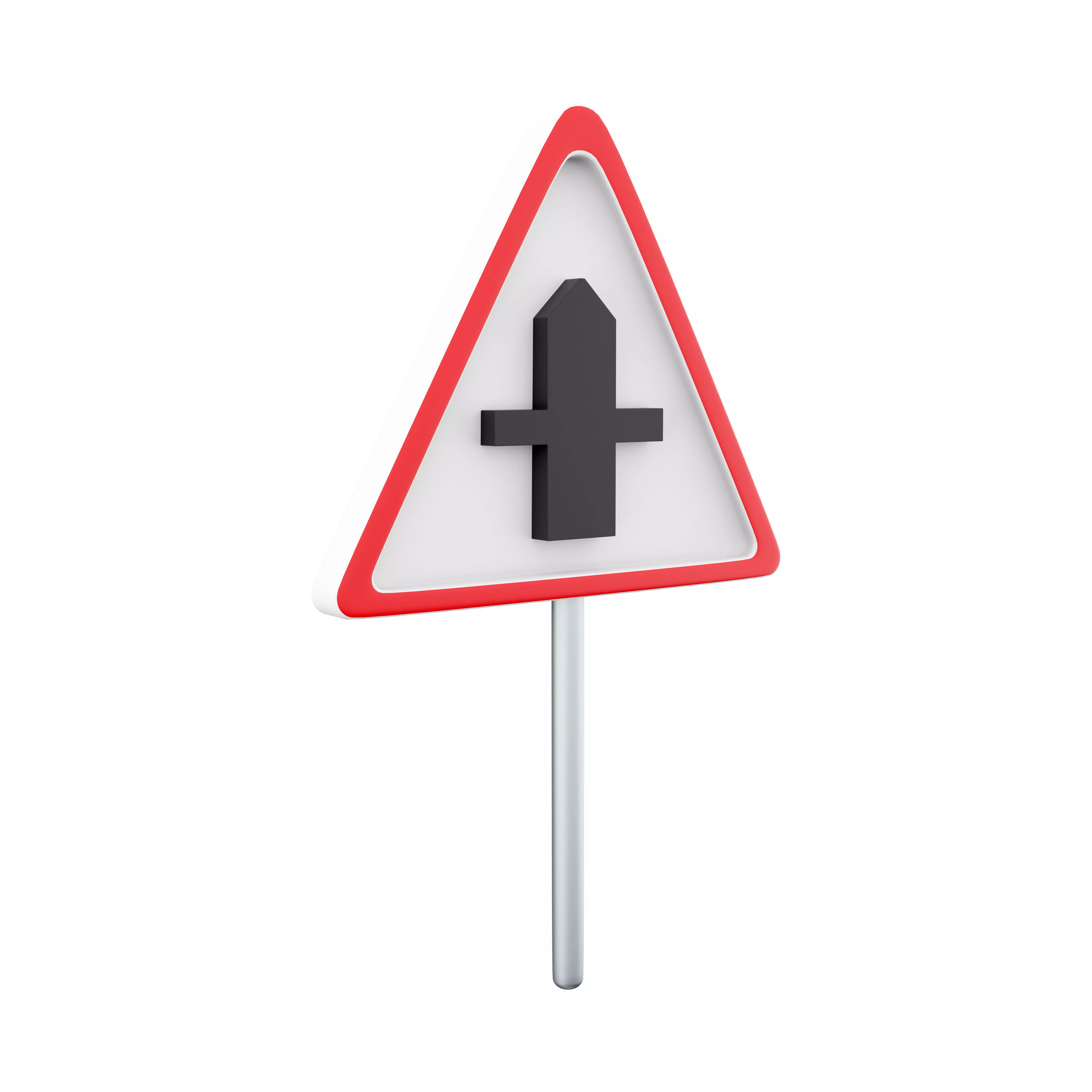 3d render of a UK crossroad ahead road sign. It consists of a crossroad symbol contained within a red triangle. 3d render crossroad ahead road sign cartoon icon