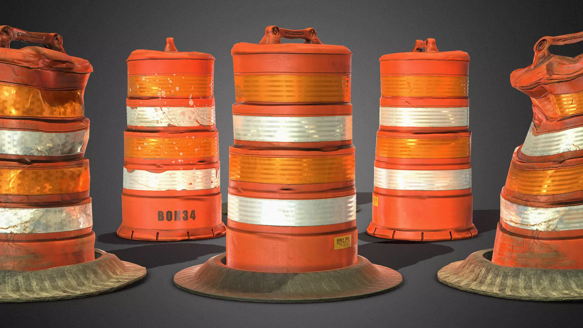 Excellent Package of 3D Traffic Drum Barrels with Tire Rubber Bases! Great 3D models that will enhance your construction sites, streets or city highway environments in your game level. Includes 4K PBR Textures created with high-poly 3D geometry! Includes various textures, clean, dirty and damaged versions with 3d models to help you create a multitude of game prop combinations, for your game engine or personal projects!