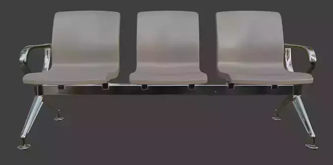 High-quality 3D model of a modern 3-seater airport waiting bench with sleek chrome metal frame and comfortable padded gray upholstery on seats and backrests. This beam-style public seating features sturdy angled legs, armrests, and realistic metallic reflections, ideal for airport terminals, hospital waiting rooms, train stations, office lobbies, clinics, and other public spaces.Perfect for architectural visualization, interior renders, game environments, VR/AR experiences, and urban scenes. The model is optimized with clean topology, UV unwrapped, and PBR materials for high realism while maintaining performance.Key Features:
