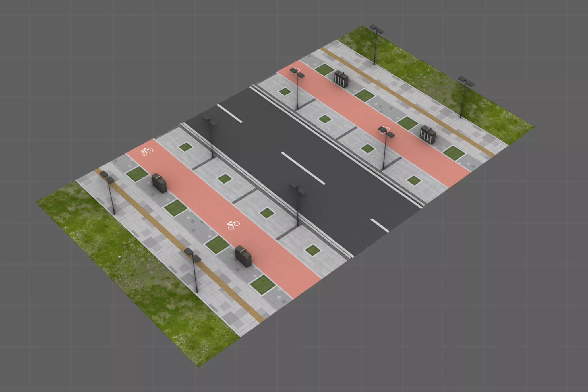 This 3D low-poly model represents a simplified urban road unit, designed for efficient rendering in real-time applications such as video games or simulations. The model features a central two-lane road flanked by sidewalks on both sides. The sidewalks are detailed with pedestrian pathways, small patches of greenery, and evenly spaced street lamps, providing a sense of urban infrastructure. The road includes lane markings and a median strip, enhancing realism. The surrounding areas are depicted with grassy patches, adding a touch of nature to the urban environment. The model's low-poly design ensures it remains lightweight while still conveying the essential elements of a typical city street layout. This makes it ideal for use in scenarios where performance is crucial, yet a recognizable urban setting is required.