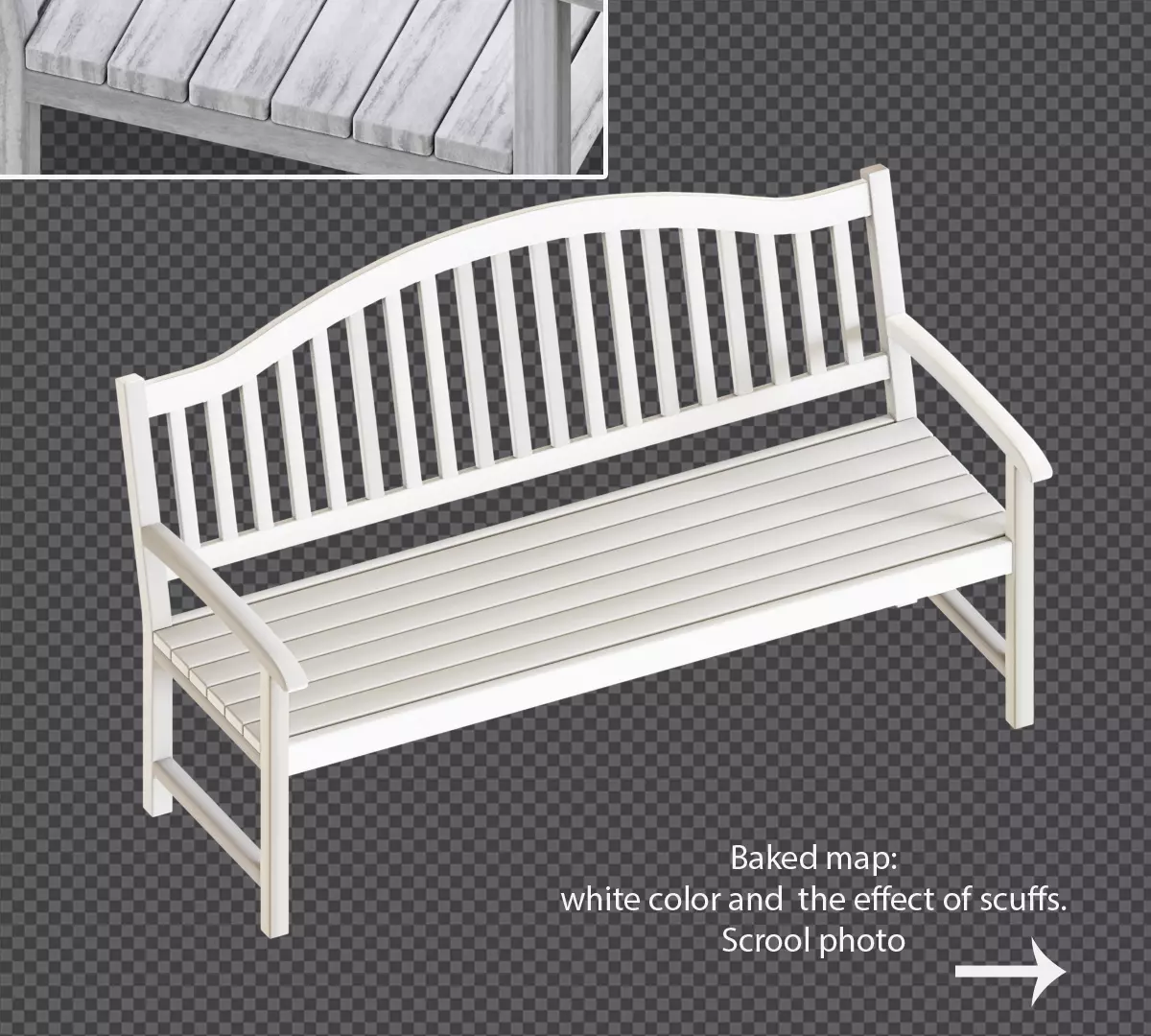 Street bench with 4 color textures - you can choose a uniform white or old scratches / uneven coloring of varying degrees of intensity.