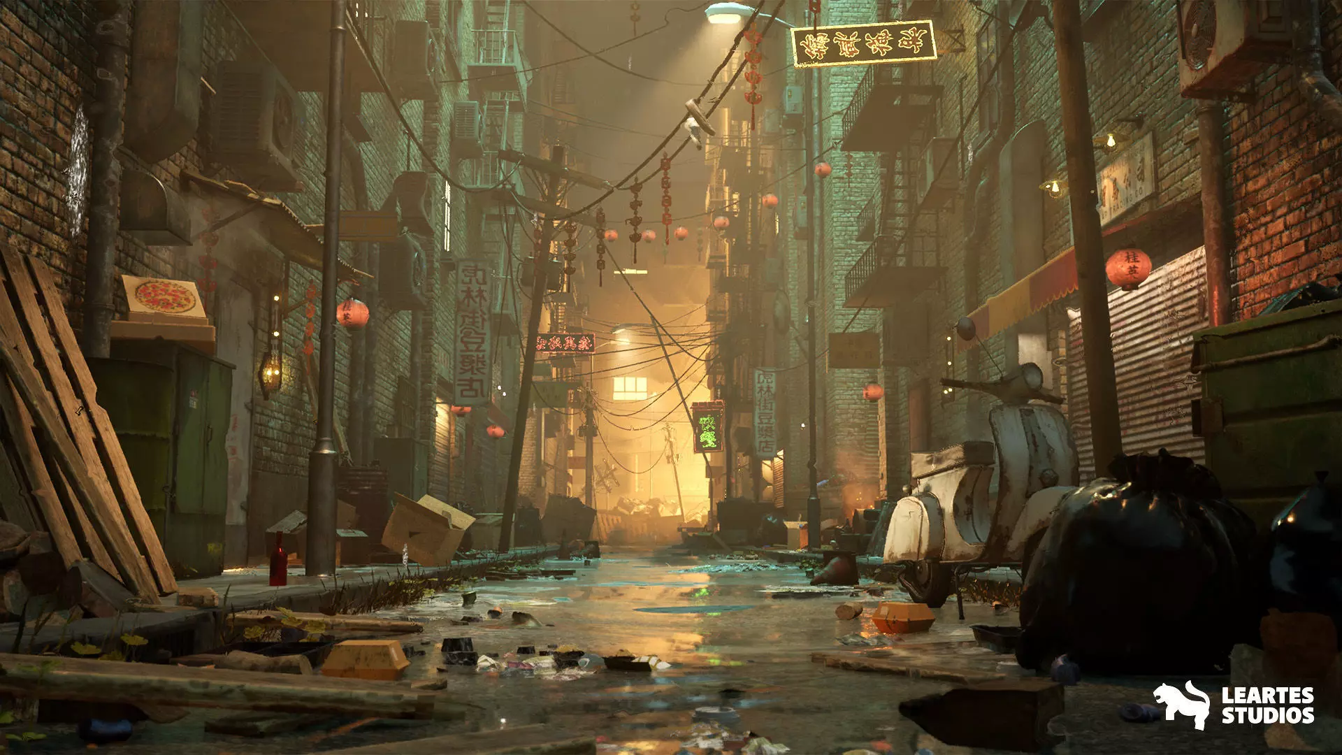 In the Chinese Alley project, you can access high-quality meshes and textures designed for your Asian-themed project, including elements like rain and sparks among the ruins. This allows you to create your own chaotic Chinese environments while benefiting from dynamic effects.