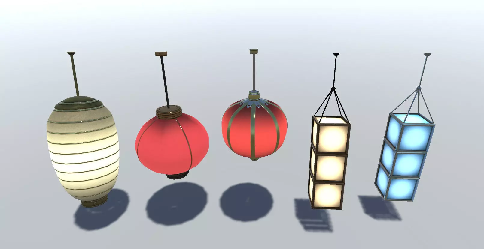 Animated Chinese lantern set with 5 different lanters. With textures for PBR shading (2048*2048 pixels) diffuse, normal, emission, specular and gloss maps. Also available the Unreal version on this package.