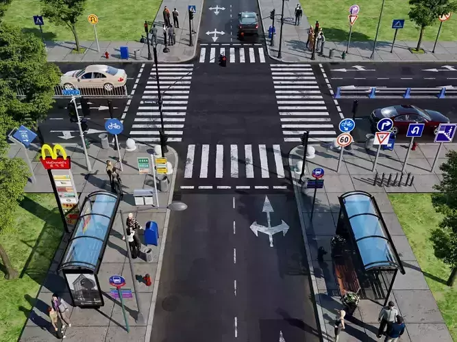 A highly detailed and realistic 3D city street intersection scene, designed specifically for modern urban environments.The scene includes a complete intersection layout, featuring road markings, pedestrian crossings, traffic lights, street signs, bus stops, sidewalks, street furniture, vehicles, and pedestrians, making it ideal for high-quality visualization and real-time applications.All assets are meticulously modeled with clean topology and realistic proportions.Textures are optimized for close-up rendering while maintaining excellent performance in large scenes.Ideal for:Urban Visualization Architectural Visualization Games and Real-Time Engines Film, Animation, and VFX ProductionKey FeaturesComplete city street intersection sceneRealistic road textures and pedestrian crossing markingsTraffic lights, street signs, guardrails, bollards, trash cans, mailboxesBus stop with shelter and signageSupports PBR materialsClean topology and optimized meshScalable modular layoutTechnical Details