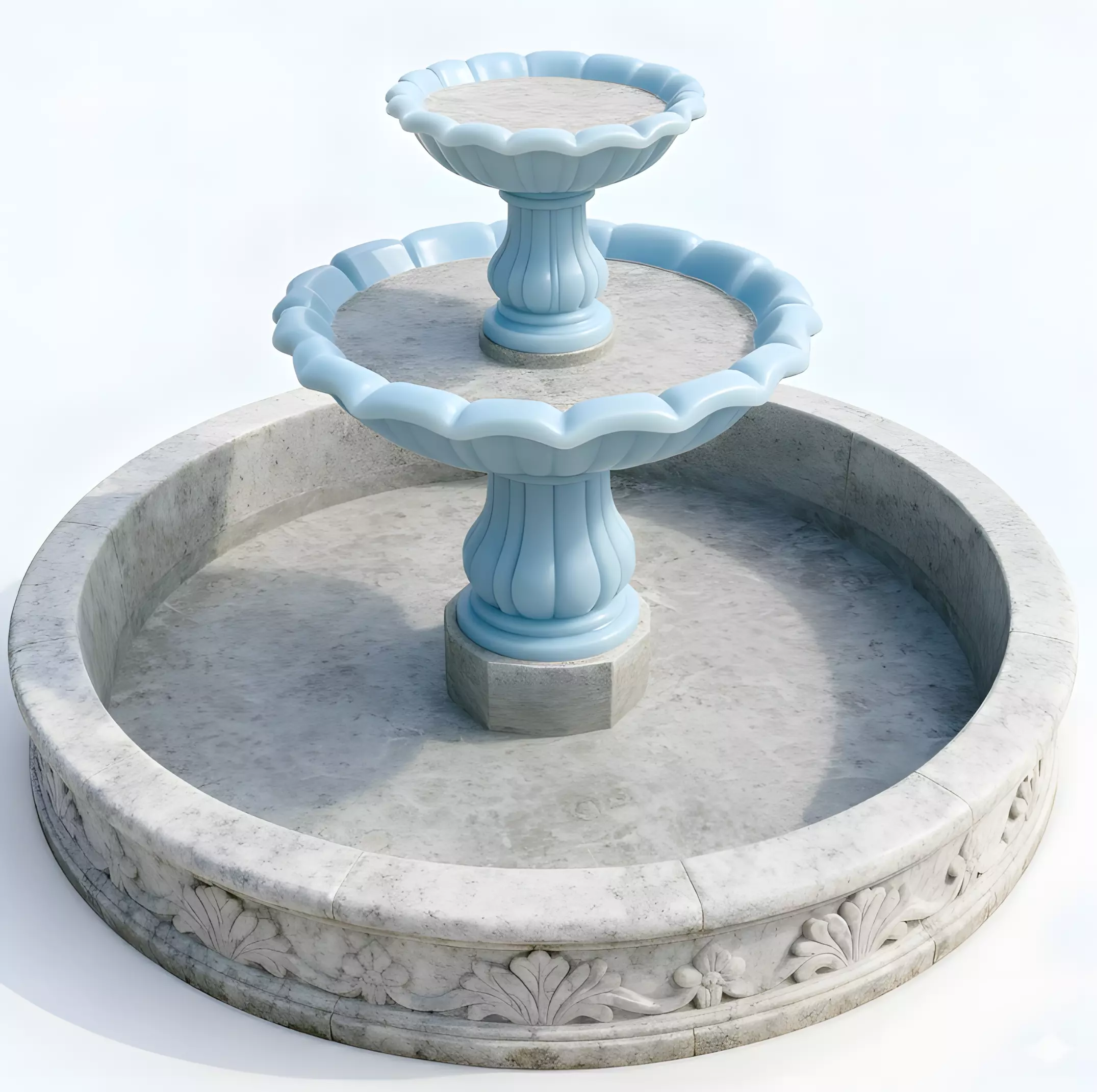 Fluted Pedestals The blue bowls are held up by curved, fluted pillars. These central supports are designed to look like classic architectural columns, guiding the eye upward to the top where the water would naturally bubble out.