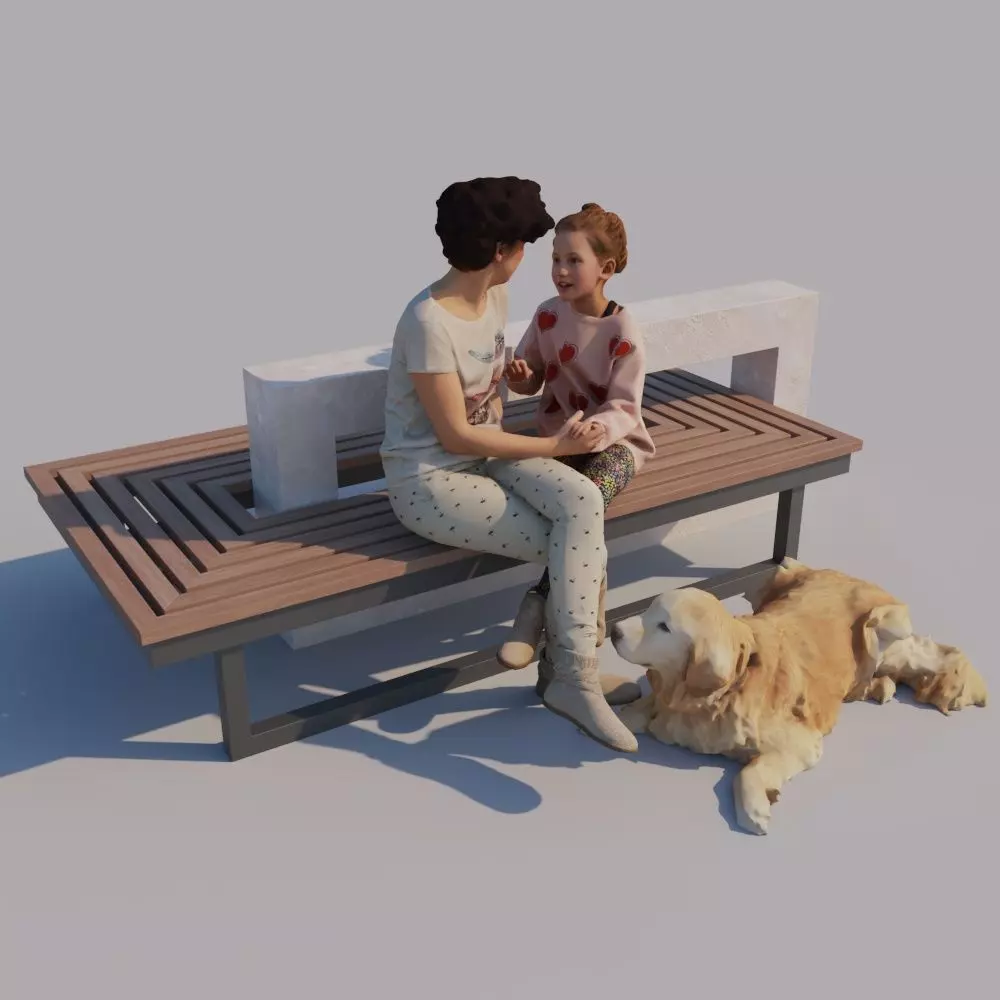 Contrasting the concrete foundation, the seating surface and backrest are thoughtfully constructed from rich, warm wood. The wooden elements bring a touch of nature to the design, infusing the bench with a sense of warmth and inviting charm. The wood grain is carefully detailed, adding a tactile dimension to the 3D model and contributing to the overall realism.