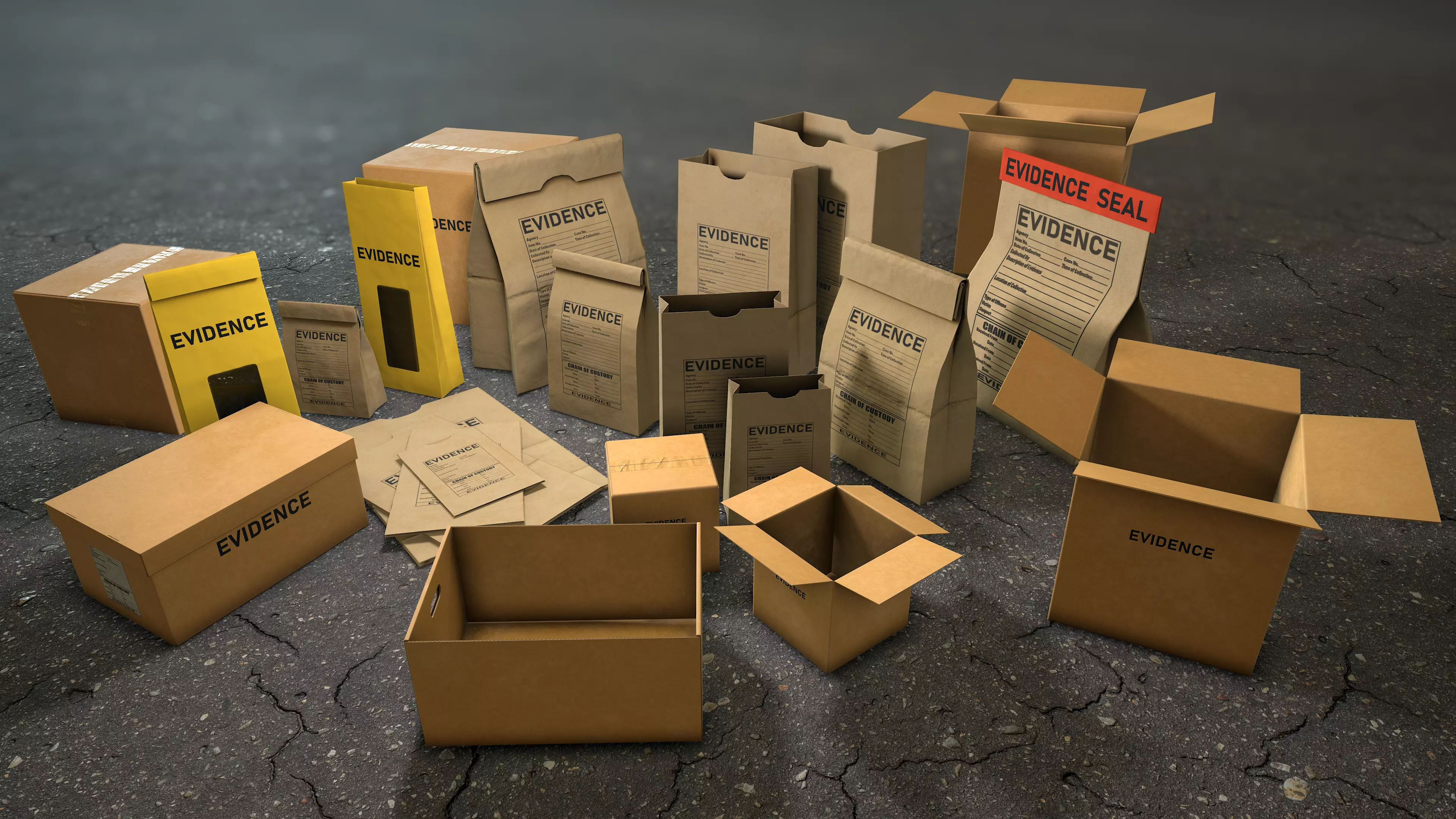 Evidence Packages and Boxes Collection for your crime or horror game.