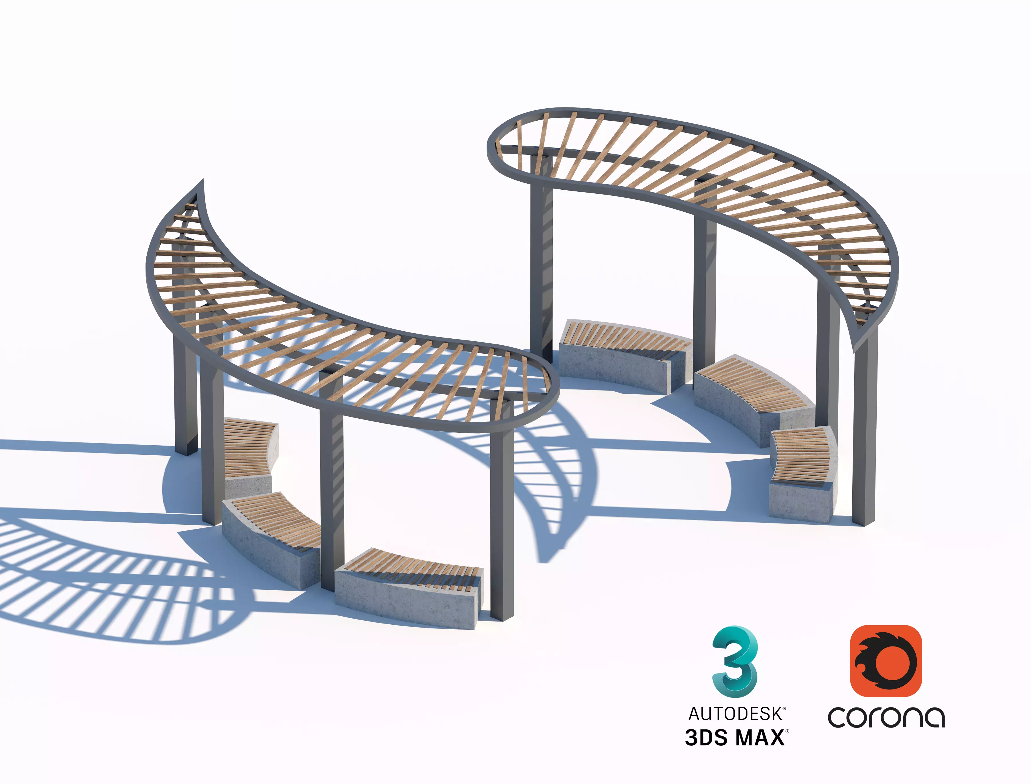 Curved Outdoor Seating Area with Wooden Canopy 3D model