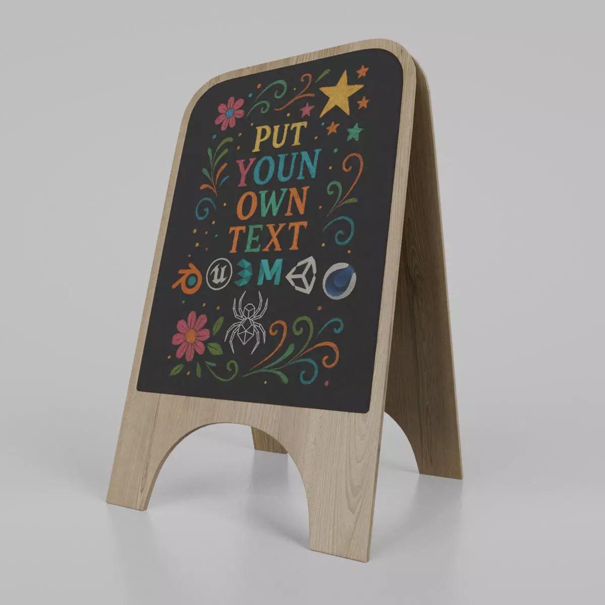 • Customizable Chalkboard Surface — Ideal for adding your own text, graphics, or advertisements.• High-Quality Textures — Handcrafted wooden frame with realistic details for a natural, authentic look.• Clean Topology & Real-World Scale — Quad-based topology ensures smooth surfaces for high-quality renders and animations.• Optimized for Real-Time Use — Game-ready, suitable for offline and real-time engines such as Unity, Unreal Engine, and other game engines.• Fully Organized Hierarchy — Easy to use, with proper pivot points and clear object structure.