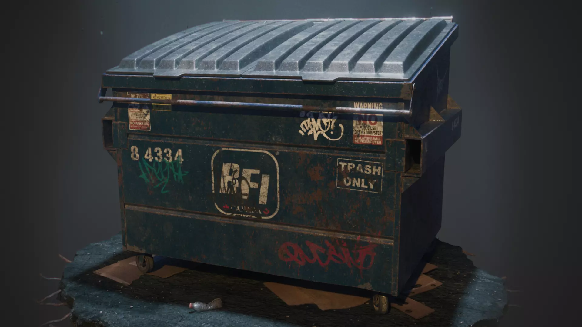3D model of dirty ol' dumpster, perfect for populating your urban scenes for any project whether it's a feature film or AAA game.