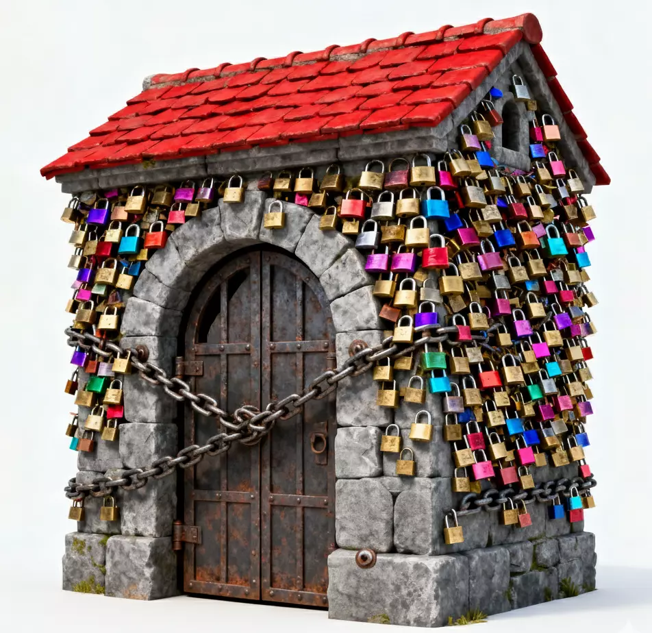 Hundreds of Unique PadlocksThe walls are densely packed with padlocks in various metallic finishes and vibrant colors, including gold, pink, blue, and teal. This wall of wishes provides a massive amount of visual detail and a high-contrast pop of color against the neutral stone.