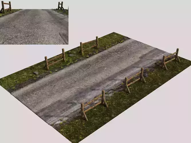 Realistic cracked asphalt pavement with natural wear marksGravel roadside with scattered stones and dirtHand-placed grass and vegetation along the roadsideWeathered wooden fence posts with naturally varying texturesGeometry optimized for real-time renderingSimple topology and orderly structureScalable and easy to integrate into large scenesSuitable for open-world games and indie gamesDriving simulation gamesRural or suburban environmentsAll models and OBJ files were created using 3ds Max 2020 VR rendering.