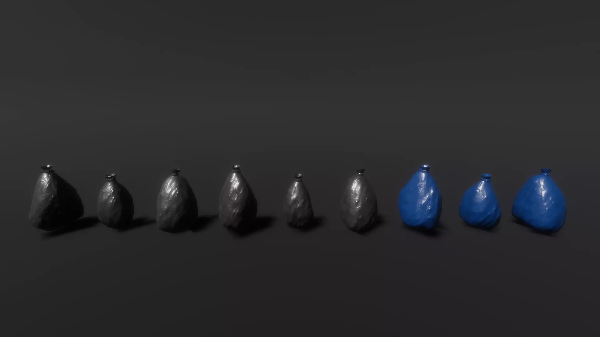 • 9 unique, low-poly garbage bag meshes