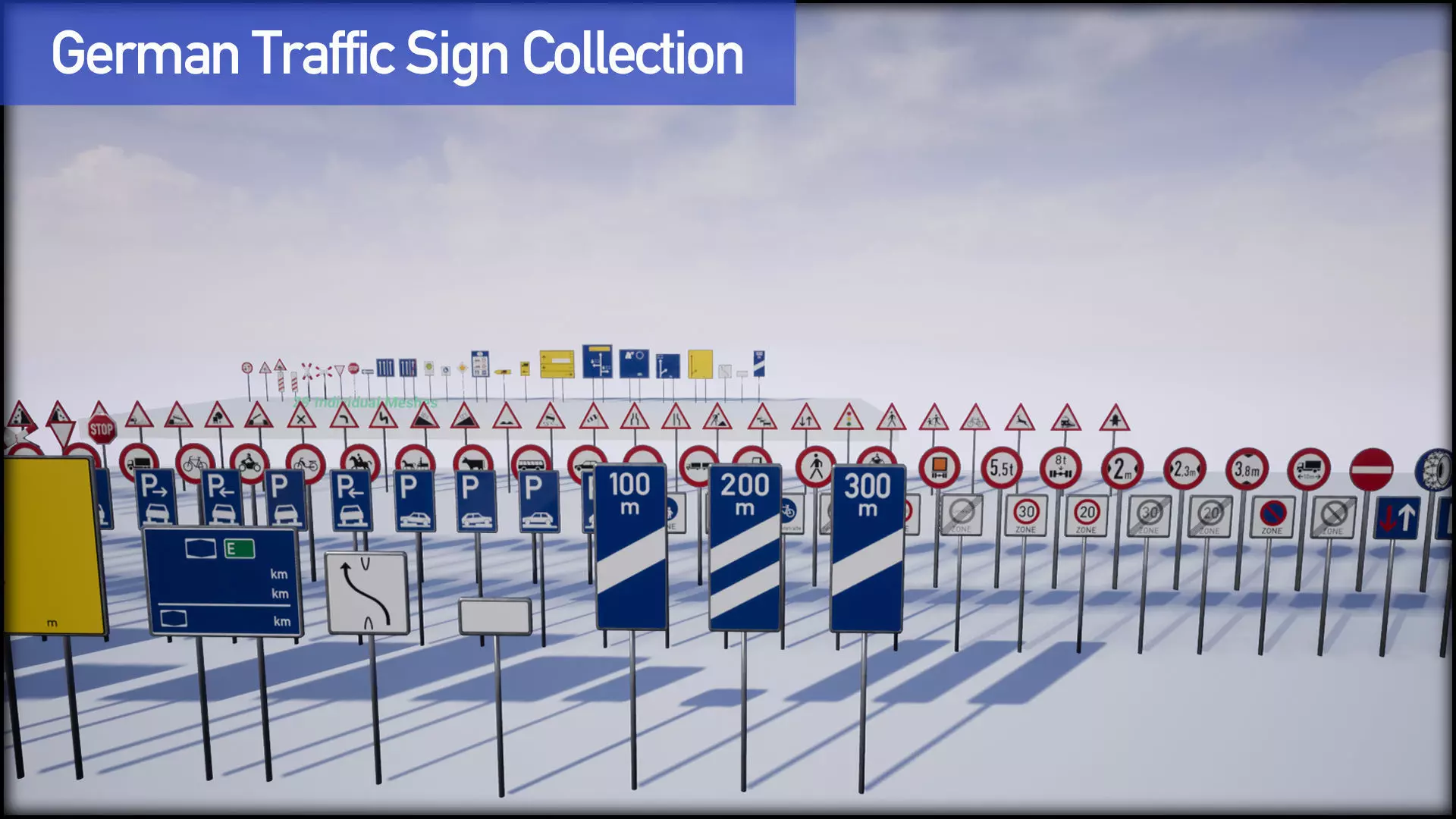 25 different types of meshes (traffic, warning, street signs)Over 250 Textures (skins)A Blueprint system that allows you to modify numbers, city names, motorway names, etc.Texture resolutions are rather even throughout the pack (square objects being 1k in resolution, rectangular signs up to 2k), and polygon levels are fairly low.