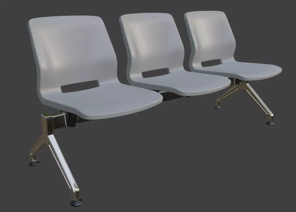 High-quality 3D model of a modern 3-seater airport waiting bench with sleek chrome metal frame and comfortable padded gray upholstery on seats and backrests. This beam-style public seating features sturdy angled legs, armrests, and realistic metallic reflections, ideal for airport terminals, hospital waiting rooms, train stations, office lobbies, clinics, and other public spaces.Perfect for architectural visualization, interior renders, game environments, VR/AR experiences, and urban scenes. The model is optimized with clean topology, UV unwrapped, and PBR materials for high realism while maintaining performance.Key Features:
