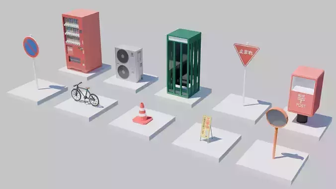 Included Assets:Vending Machine: Classic Japanese beverage dispenser.Mailbox (Post): The signature red Japanese postal box.Telephone Booth: Traditional green public phone booth.AC Outdoor Unit: A must-have for realistic Japanese building exteriors.Traffic Signs: Including Stop (Tomare) and No Parking.Traffic Cone: Standard road safety asset.Construction Sign: Foldable yellow warning board.Curved Traffic Mirror: Essential for narrow Japanese intersections.Bicycle: Simple commuter-style bike.
