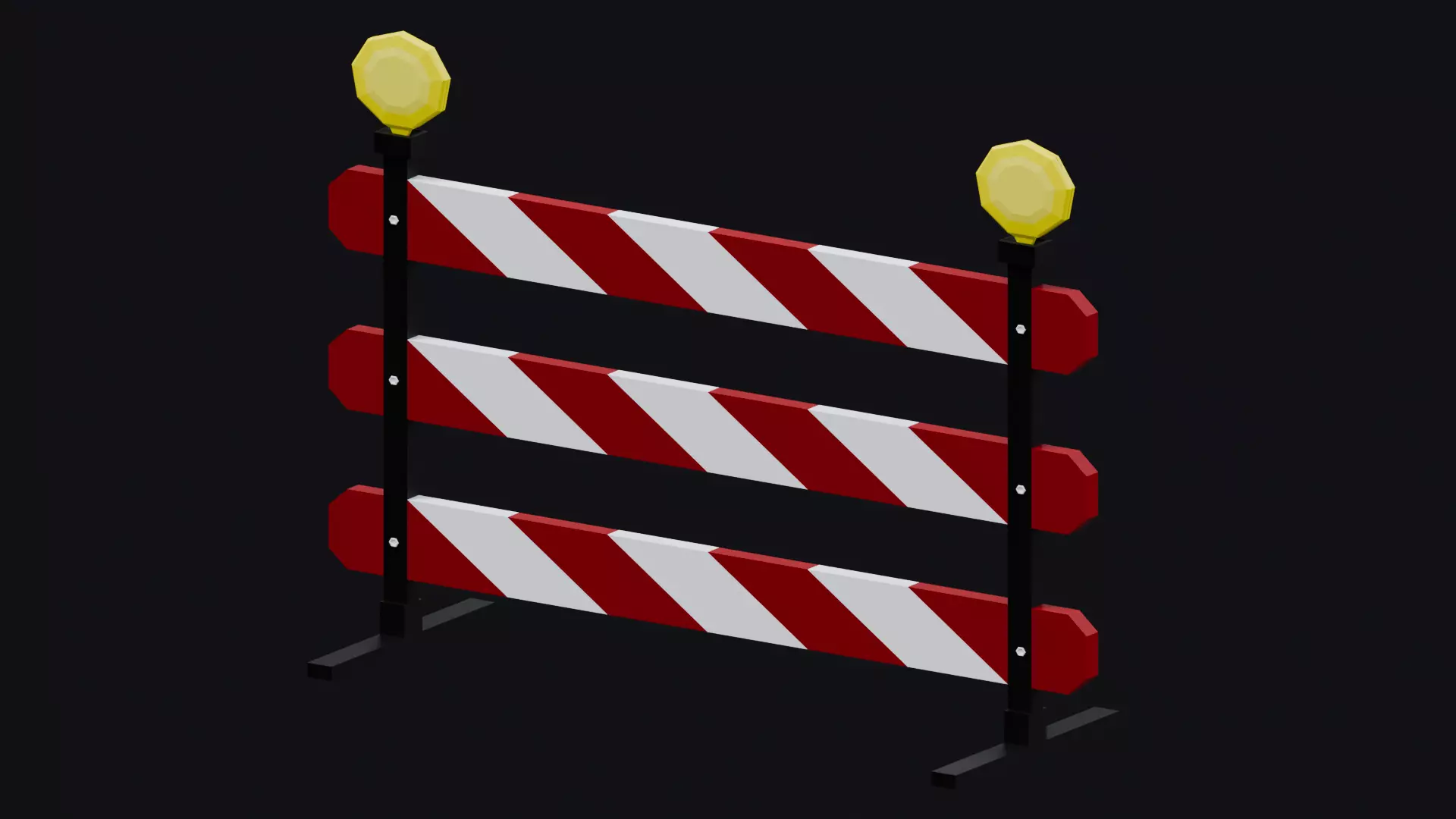 A stylized low poly road construction barrier with warning lights, designed for blocking roads, marking construction zones, and guiding traffic in games and real-time environments.