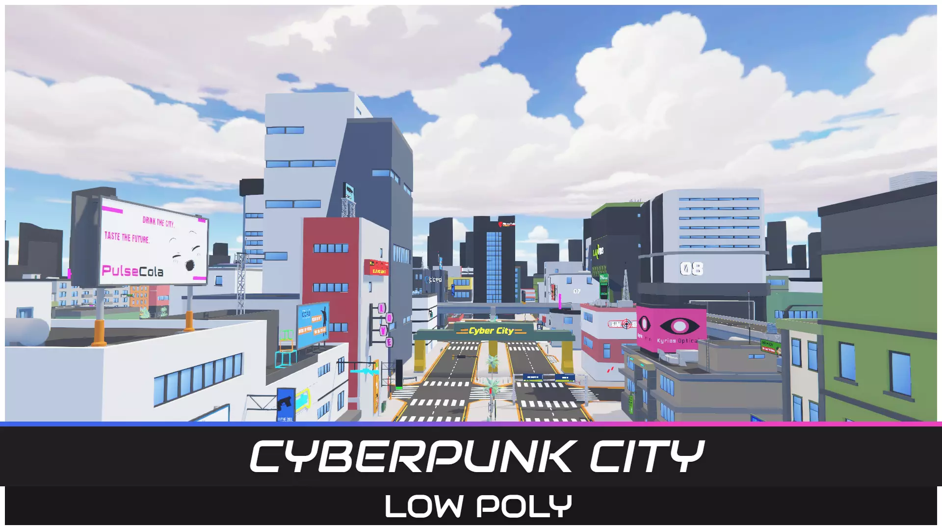 A Low Poly Cyberpunk City with a retro style with buildings, street tiles, billboards, ads and environment assets to suit any type of game.