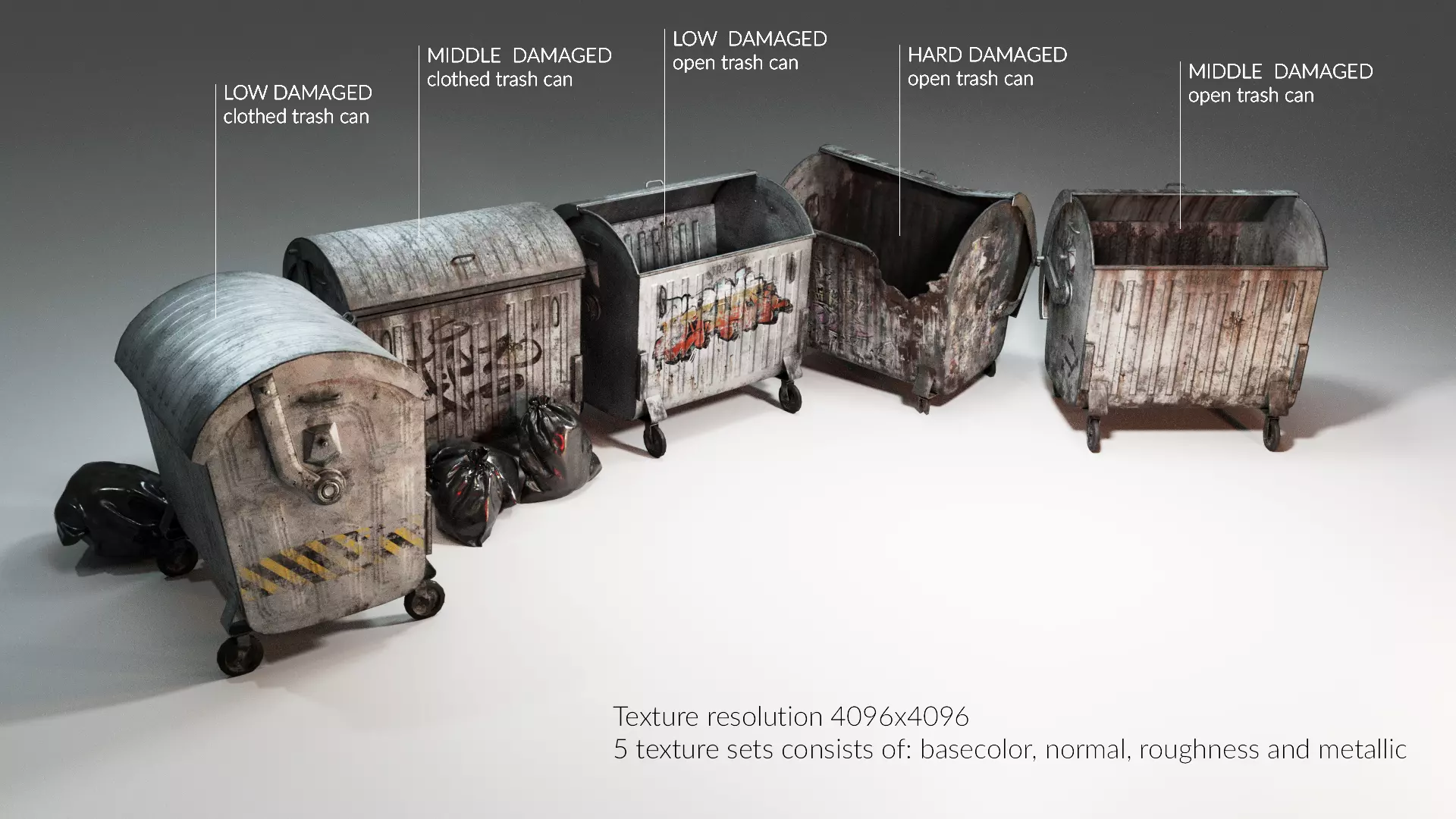 A pack consisting of 5 low-poly models of trash bins with varying levels of damage.