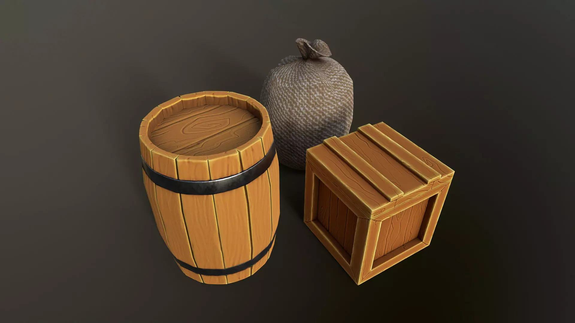 Handpaited stylized game asset, low poly containers in cartoonish style. Ready for gamedev. Every prop has a separated 2K .png textures. Barrel: albedo, normal, metalness and roughness Box and Sack: albedo and normal. Normal Maps are OpenGL. Check my profile for more stylized props and wright to me if you have any questions.