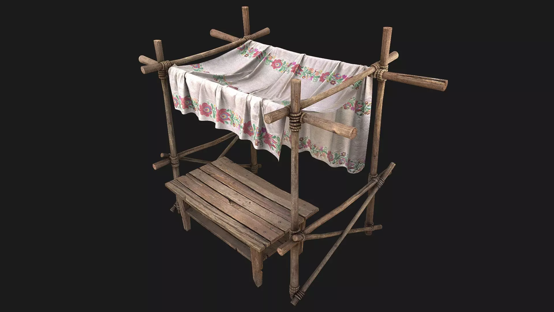 Game ready model. Market Stalls Tent fully textured, sculpted and rendered with Physical based rendering (PBR) - Shown images have been rendered in Marmoset Toolbag .The models contains lods, detailed information on the images.The model consists of two UV Maps :Table(4096x4096),Tent(4096x4096).