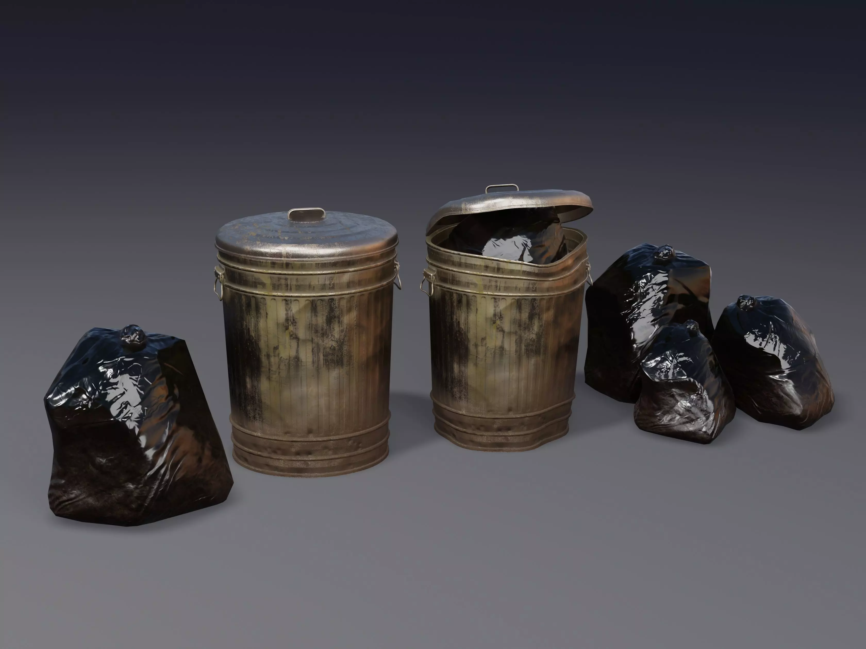 Metal Trash Can and Bags - Game Ready Low-poly 3D model