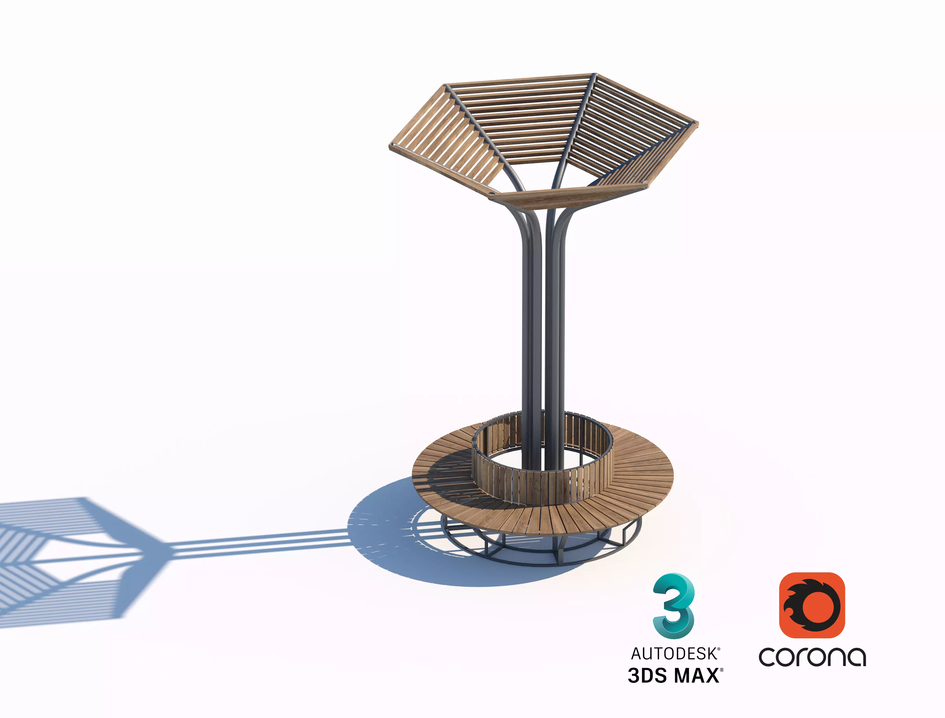 This tree-inspired seating structure features a circular bench and a unique wooden canopy, offering both style and shade for public spaces or parks. A perfect combination of functionality and contemporary design.