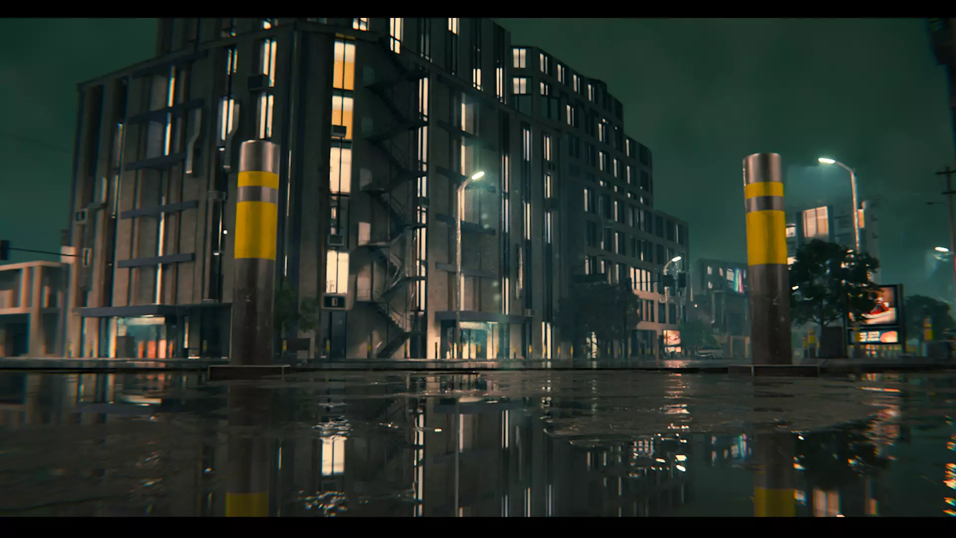Lighting: Custom setup with streetlights, puddle reflections, and volumetric haze