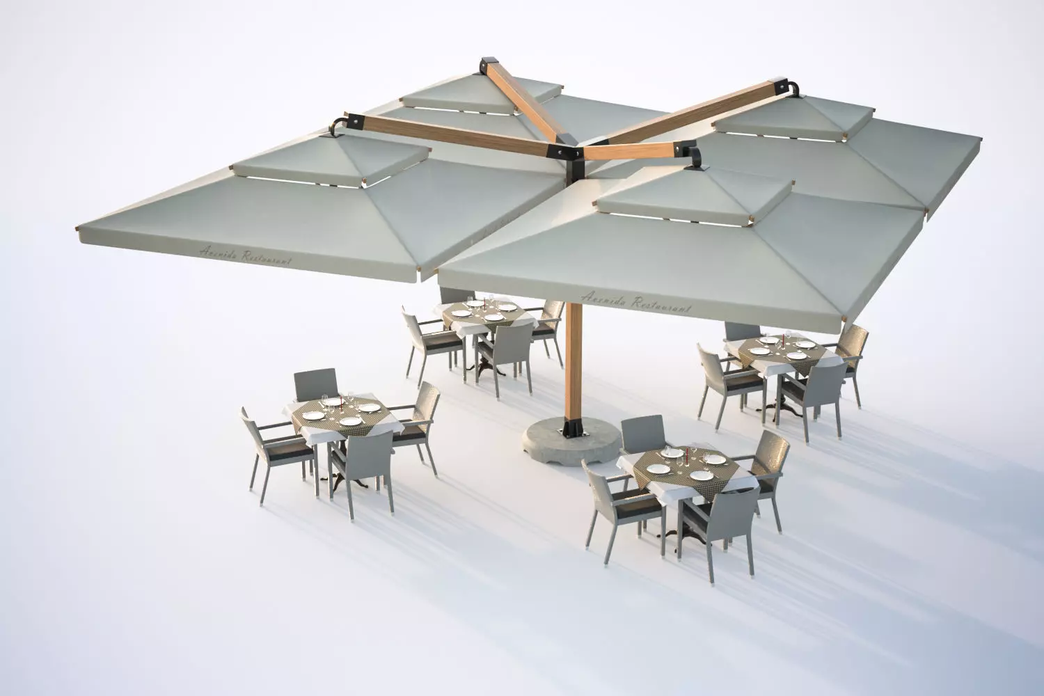 Thi set includes outdoor restaurant tables. Pots with vegetation around and the front of the building with huge glass windows.Model prepared for 3d architectural visualisations and other graphic works.