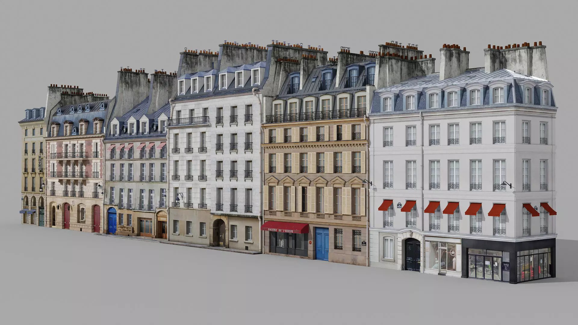 Available in blend, obj, fbx formats. Models don't use any external plugin or script. Models are based on real facades. Rendered in Blender 3, CyclesX.