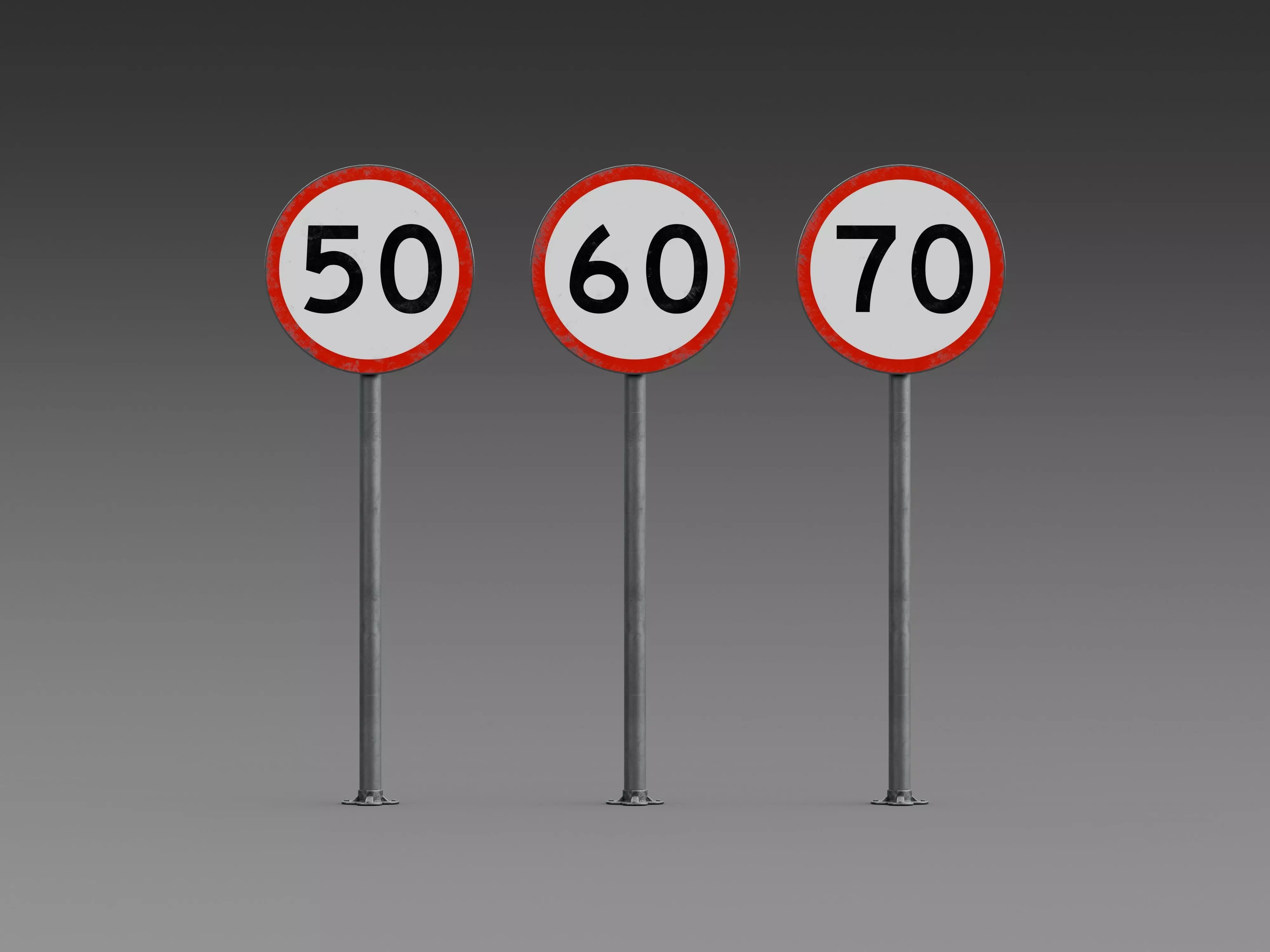 This 3D model pack includes three circular road signs displaying speed limits of 20, 30, and 40. Each sign is modeled with precision and realism, featuring detailed mounting brackets and pole geometry. The set is designed for use in architectural visualization, simulation environments, and game development.