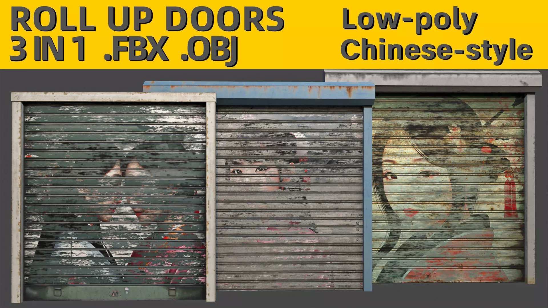 3 DoorsChinese-styleLow-poly. Door№1 - 24 triangles, Door№ 2, 3 - 32 trianglesThree formats are available for download: .OBJ .FBX .Max formats2K Textures. Base color , Ambient occlusion, Roughness, Glossiness, Metallic