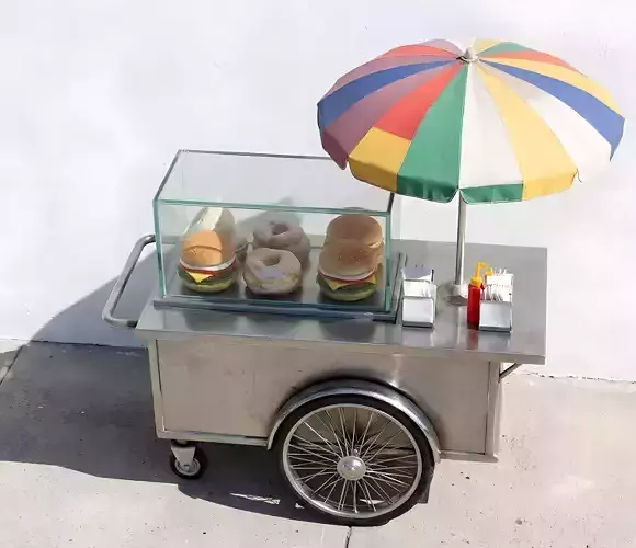 The Overall Concept This asset is a mobile street food cart constructed from shiny stainless steel. It is the kind of vendor stand you would see in a busy city park, at a carnival, or on a sidewalk selling lunch to passersby.