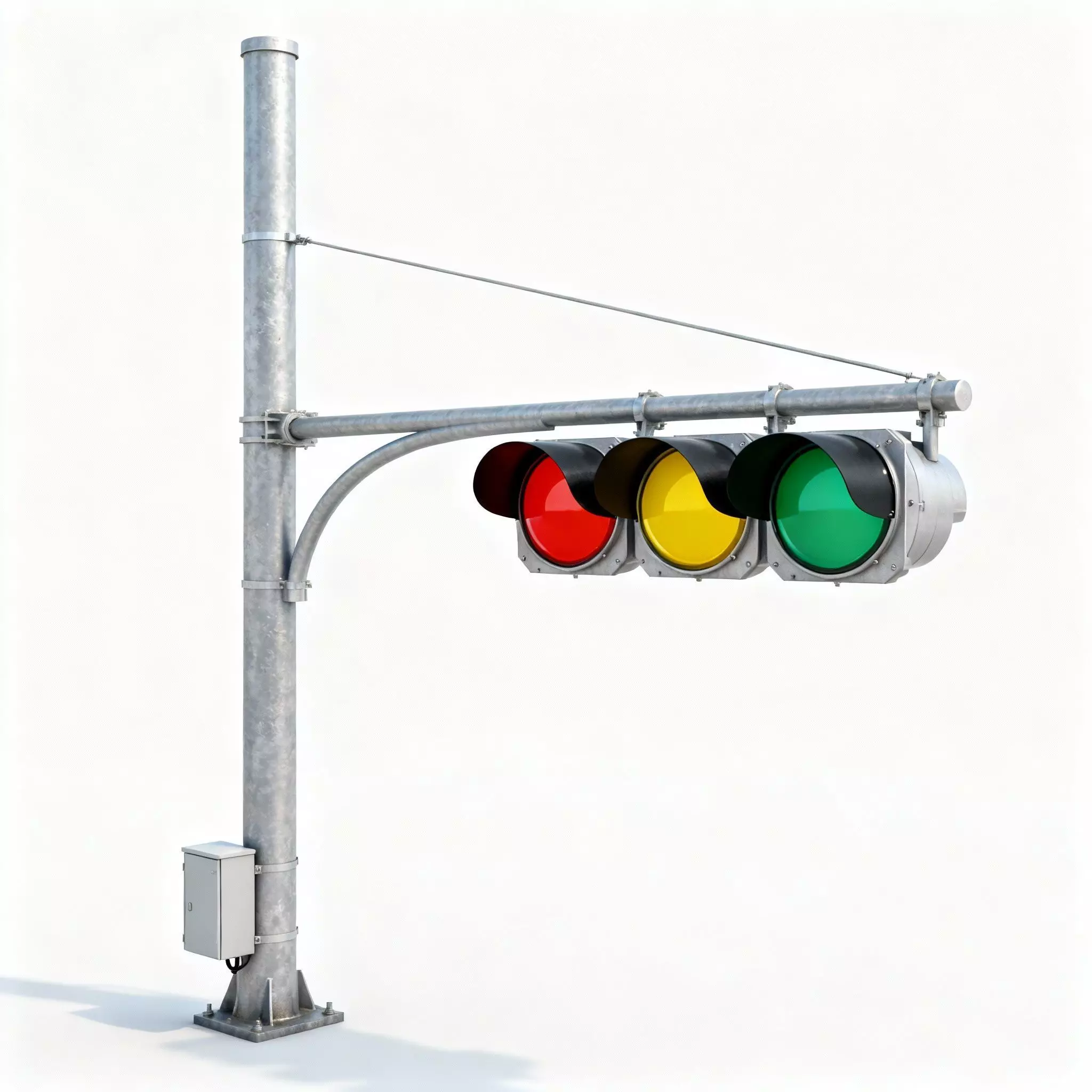 Galvanized Steel Structure The pole and arm feature a realistic galvanized steel texture. The mottled grey surface mimics the weather-resistant coating used on real infrastructure, differentiating it from painted metal poles.