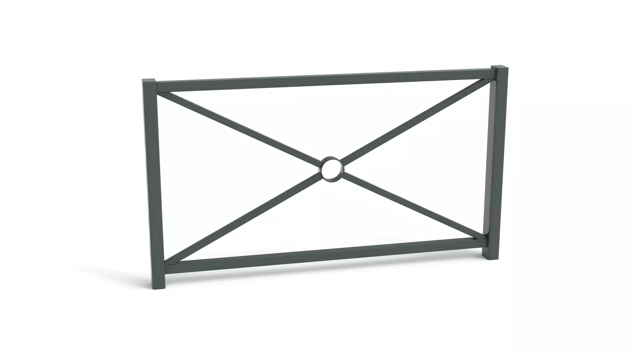 A green metal fence used alongside roads to separate pedestrians from vehicular traffic. Welded steel construction, painted glossy green. Approximately 80cm tall, 145cm wide, and 8 cm thick.