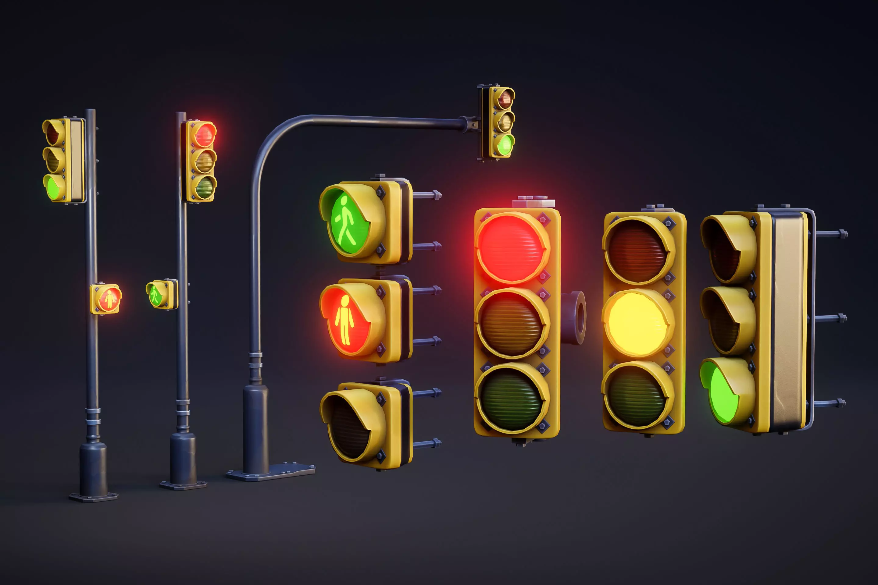 A Stylized Traffic Lights Pack, including the base poles and the traffic light boxes. You can edit the lights as you want, I've included separated emissive textures as well diffuse maps that you can edit to make a traffic light working system. The base textures are all lights turned off..