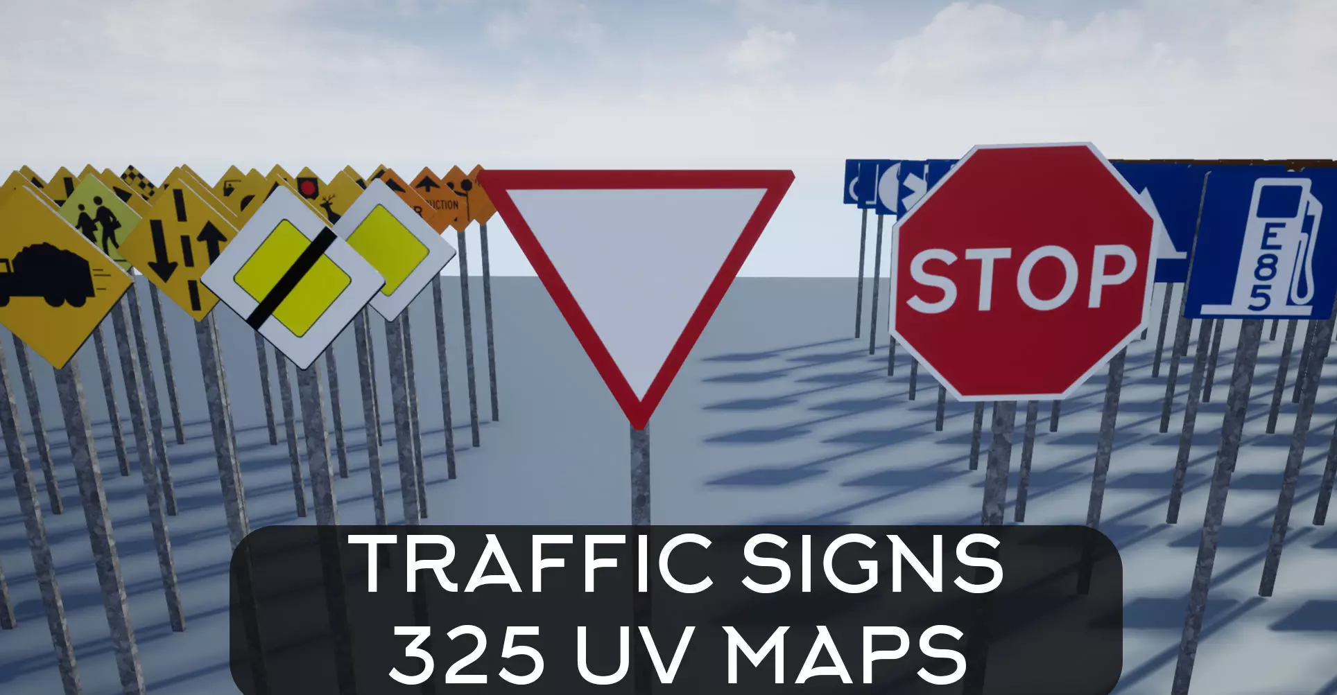 Each model has only 1 material and texture assigned. You can use all other UV maps by importing and dragging it onto the model. Textures are .jpg format. Baked UV maps are also included if you want to make custom signs.