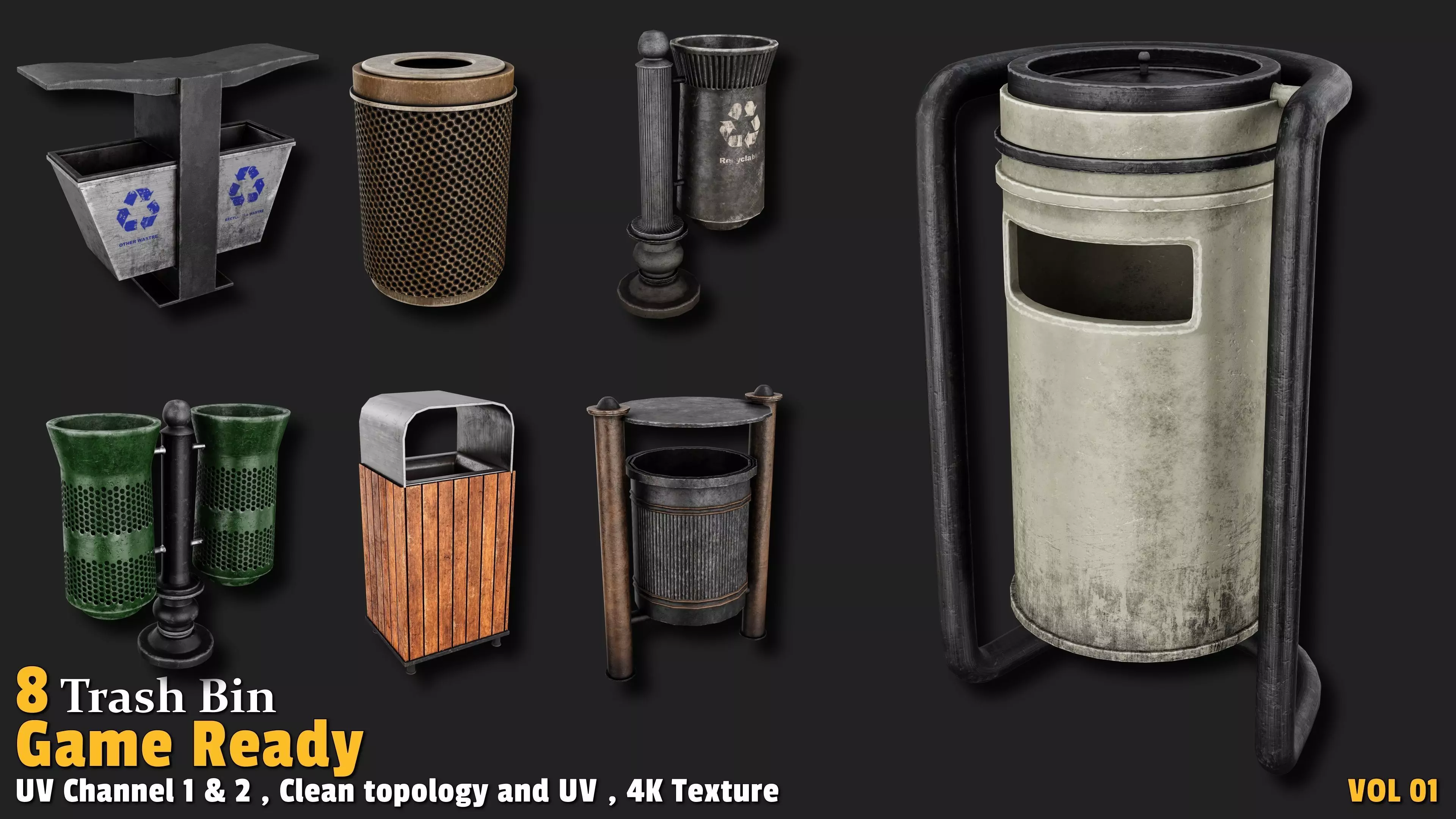 Ready to bring your game world to life with realistic, ready-to-use trash bins? This collection of 8 textured 3D trash bin models, crafted with professional materials and 4K textures (including Base Color, Normal, and ORM), is designed to add an urban and authentic touch to your game development projects! Whether you're building a modern city or designing an urban-themed game, these models deliver unmatched quality and realistic detail for an immersive gaming experience. Each model features a clean, quad-based topology with polygon counts ranging from 1,000 to 3,000, offering a perfect balance between performance and detail. UV-unwrapped with 2 texture channels, this set is fully optimized for seamless integration into your game environment without any additional adjustments.