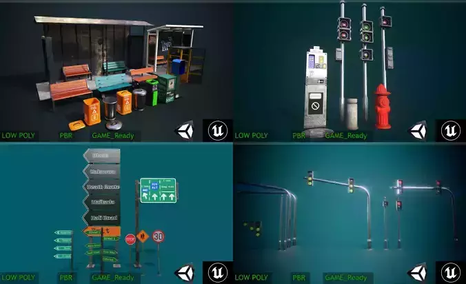 Professional Road Props Bundle featuring 4 high-quality PBR-textured road assets, perfect for game development, architectural visualization, and cinematic scenes. Each model is meticulously crafted with high-detail geometry and realistic materials for AAA-quality projects.